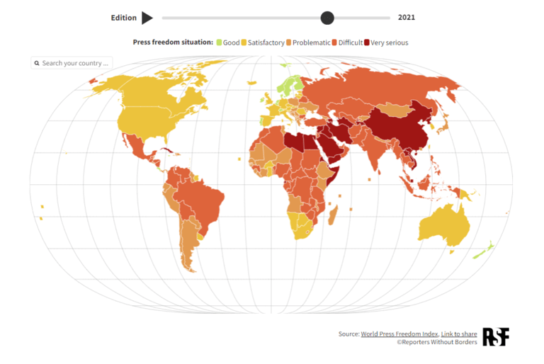 這三個國家的政治指標得分皆急遽下降,其中阿富汗因塔利班掌權後,不斷地迫害記者,政治指標排名下滑了44名。敘利亞、厄利垂亞在新聞媒體領域則幾乎沒有法治可言,兩國記者遭到拘留、失蹤或扣押為人質的人數皆創下歷史新高。