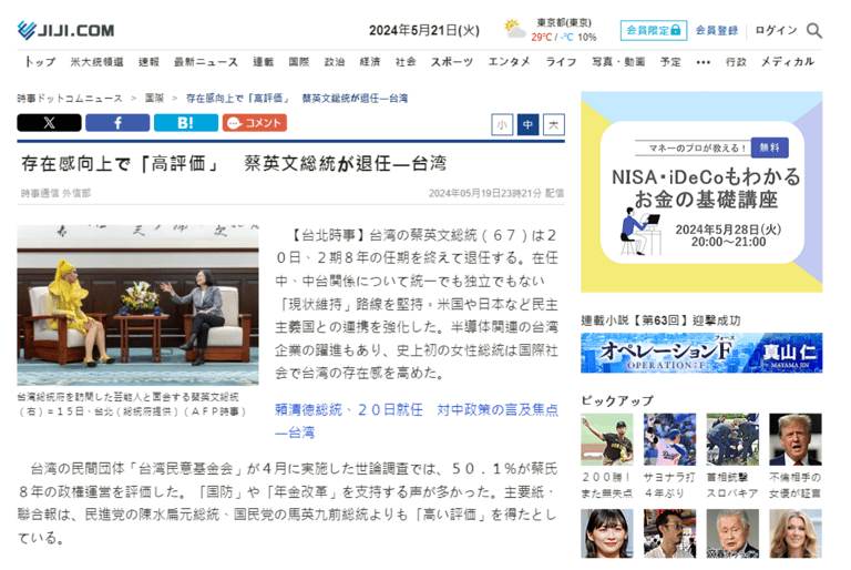 標題原文:存在感向上で「高評価」 蔡英文総統が退任―台湾