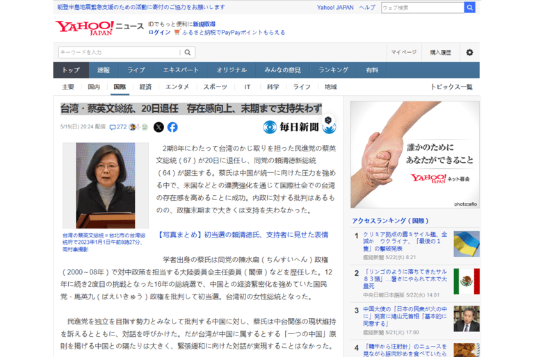 日本《每日新聞》|台灣總統蔡英文20日卸任 提升存在感,支持率到最後都未下滑
