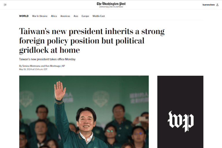 針對台灣新舊總統交接,《華郵》先是在報導中提到,賴清德上任後面臨的外交與內政局勢。隨後《華郵》指出,蔡英文在任內因捍衛台灣主權、推動同性婚姻合法、領導台灣度過新冠疫情以及加強國防部署而出名,並以高支持率結束任期。