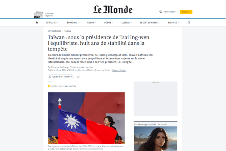 標題原文:Taïwan : sous la présidence de Tsai Ing-wen l’équilibriste, huit ans de stabilité dans la tempête