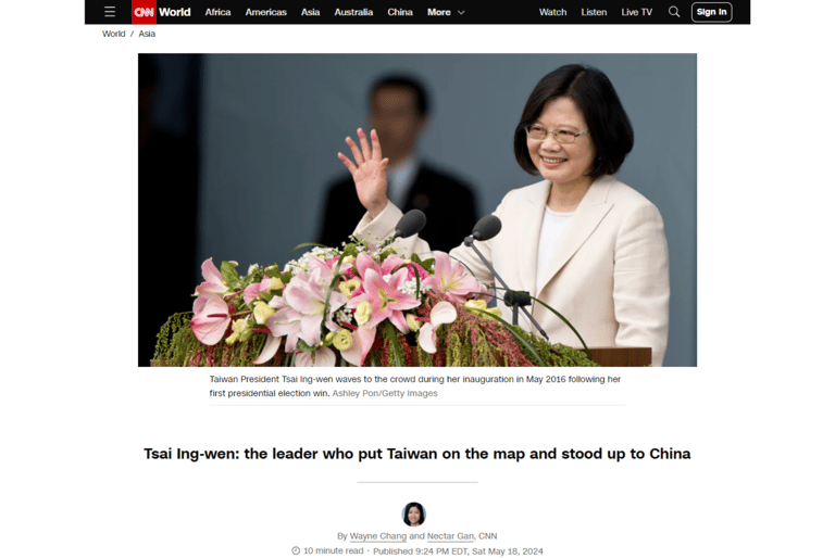 《CNN》以一篇長篇專文,詳細介紹蔡英文從政、成為台灣首位女性總統以及擔任8年總統的歷程。《CNN》描述,蔡英文是一位「非傳統的政治家」,她從小害羞,曾夢想成為考古學家,「然而,這位自稱內向的人,最終為台灣在世界最動盪的地緣政治水域,開闢出一條新航道。」