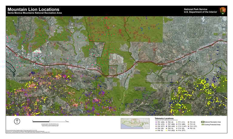 位於加州南部的聖塔莫尼卡山脈,除了可以看見山貓、土狼、騾鹿、400多種鳥類的蹤影,適應力極強的美洲獅也同樣棲息於此。然而,因人類的開發壓縮了動物的棲息地,加上交通意外的「路殺」,或是誤吃下人類投放的老鼠藥而死的動物數量卻也逐年增加。聖塔莫尼卡山脈國家休閒區的生物學家傑夫西基奇(Jeff Sikich)表示,