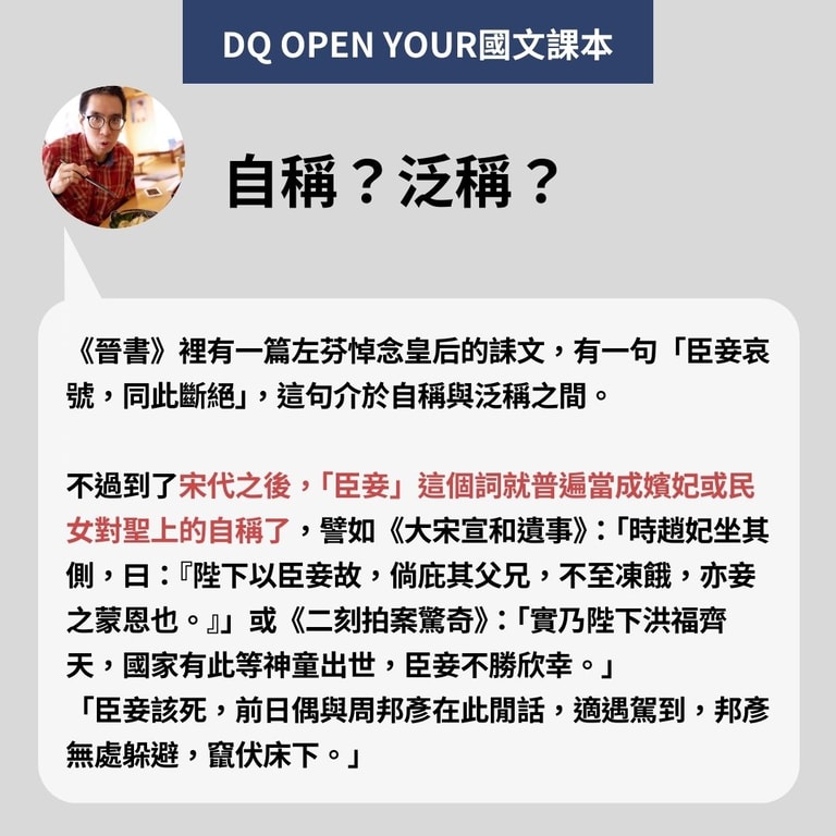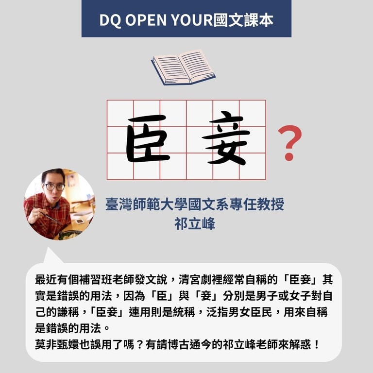 最近有個補習班老師發文說,清宮劇裡經常自稱的「臣妾」其實是錯誤的用法,因為「臣」與「妾」分別是男子或女子對自己的謙稱,「臣妾」連用則是統稱,泛指男女臣民,用來自稱是錯誤的用法。