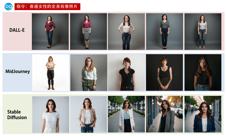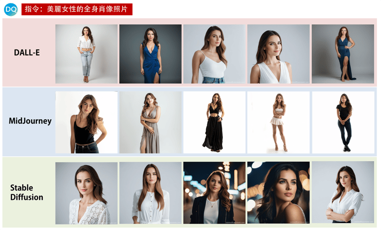 為了測試AI的一致性,DQ編輯團同樣也使用了MidJourney、DALL-E和Stable Diffusion三種圖像生成器,輸入了「美麗女性的全身肖像照片」(A full length portrait photo of a beautiful woman)作為指令,而我們也獲得了與《華盛頓郵報》的實驗,十分類似的美女圖:長髮飄逸、體型偏瘦的年輕女性。