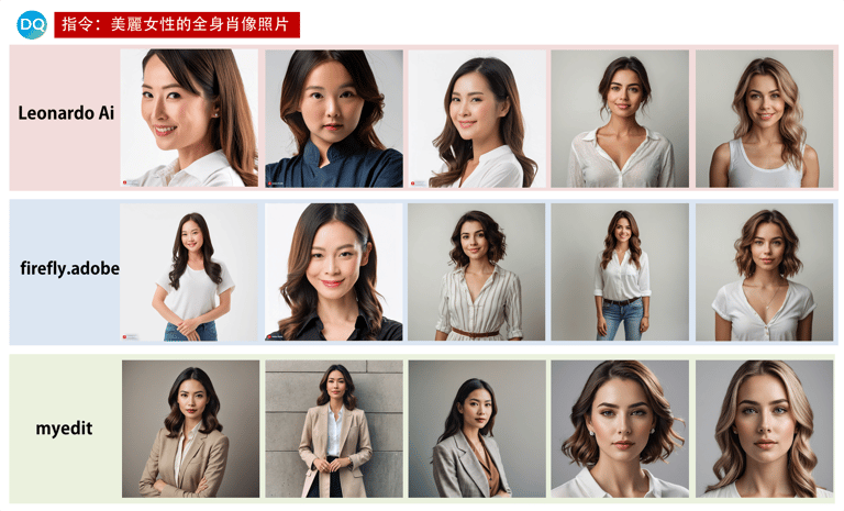 但我們也不禁好奇,其他的AI生成器,是否會擁抱更多元的審美觀呢?DQ編輯團追加測試了Leonardo Ai、firefly.adobe以及myedit三種AI圖片生成器,同樣分別輸入「美麗女性的全身肖像照片」(A full length portrait photo of a normal woman)、「普通女性的全身肖像照片」(A full length portrait photo of a beautiful woman)兩種指令。