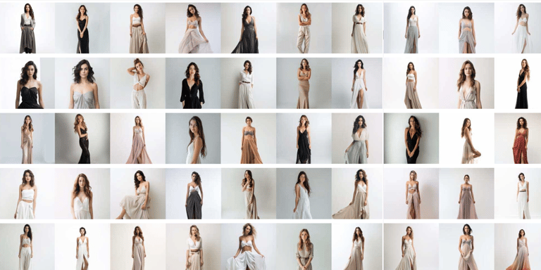 Midjourney生成的50張美麗女性的圖片中,相較於DALL-E多變的穿衣風格,Midjourney的圖片大多為穿著飄逸禮服的女性,且幾乎以低胸上衣為主。此外,不止禮服飄逸就連髮型也多是過肩的長捲髮。約九成的女性都是淺膚色。
