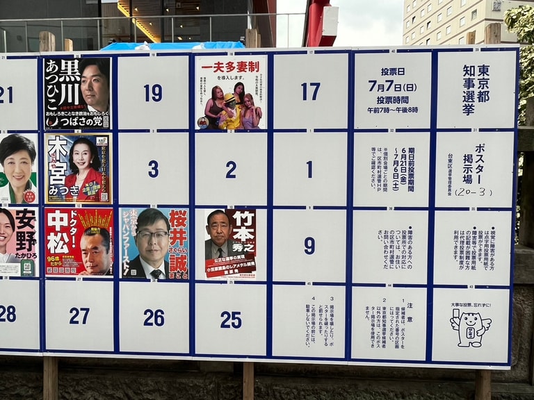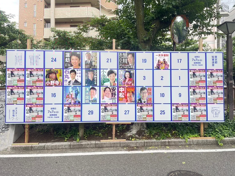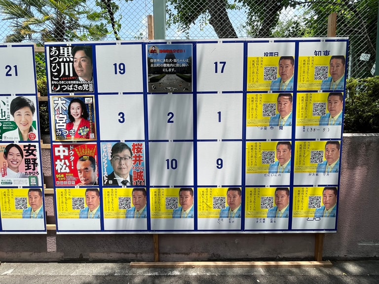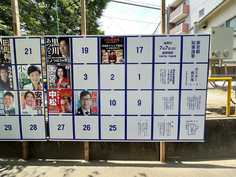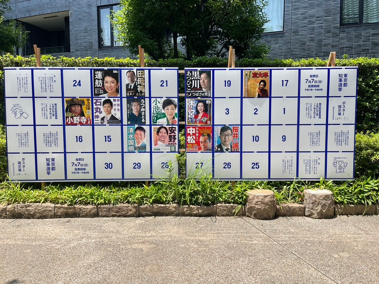 根據《日本公職選舉法》規定,競選海報只能在規定的時間內,張貼在架設於路邊的選舉海報牆上。而此次超過56名候選人參選東京都知事選舉,也因事前準備的選舉海報牆只有48格,導致部分候選人無「格」可用,只能將競選海報裝進透明資料袋,自行釘在公告欄上,引發部分候選人對於選舉不公平的抱怨。