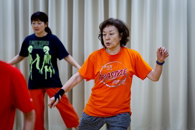 位於東京江戶川區的一間舞蹈教室中,舞蹈社團「Ara Style」38歲的負責人新井佑典,帶領10多位女性長輩,看著牆上的鏡子練習霹靂舞。雖然動作不如一般霹靂舞者快速或困難,但是每位學員的神情都十分認真,臉上還掛著大大的笑容。