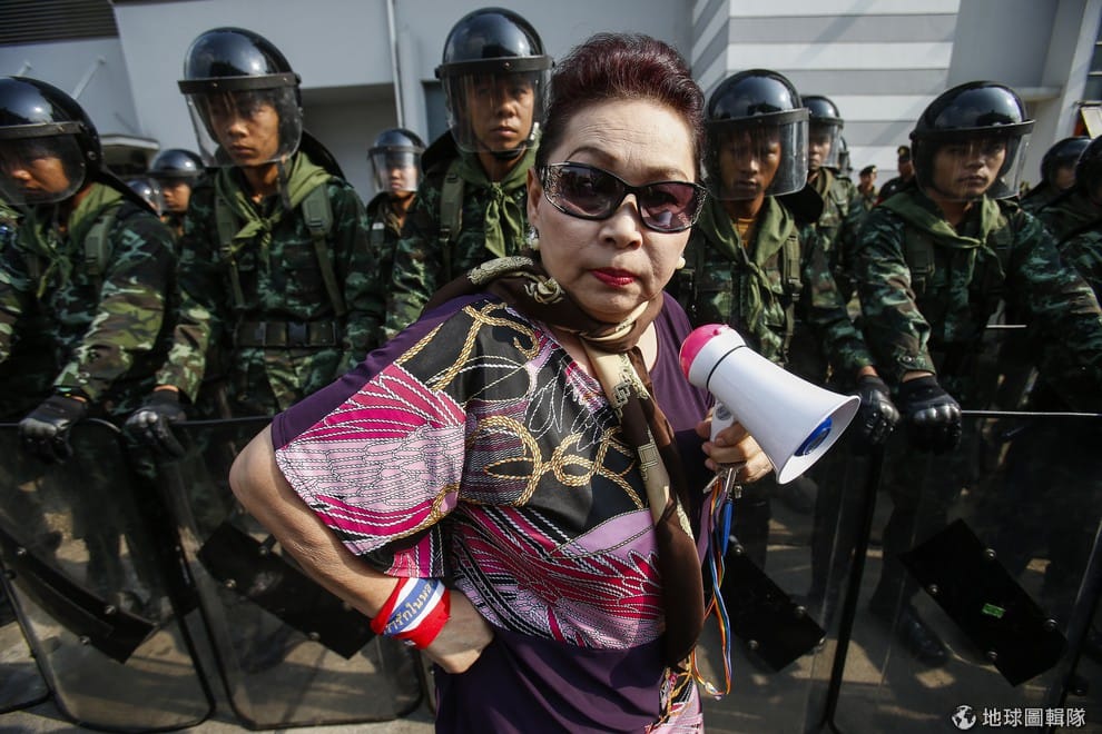 照片中的反政府示威者站在一排的泰國士兵前方,他們所在之處是國防部大樓外,目前此處作為泰國總理盈拉的臨時辦公室。19號時,泰國當地示威者們聚集在臨時辦公室外,要求盈拉下台。日前泰國爆發嚴重衝突死傷,釀成5位民眾身亡,但泰國總理盈拉對事件未做進一步表達。