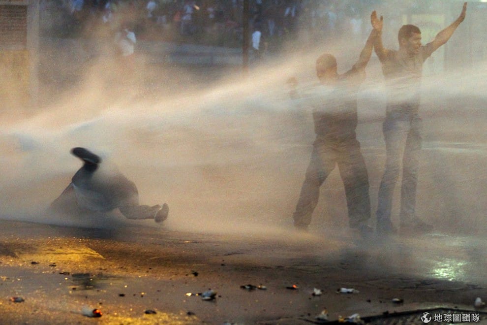 照片中,支持委內瑞拉的反對派領袖羅培茲(Leopoldo Lopez)的民眾被水柱沖倒在地上。