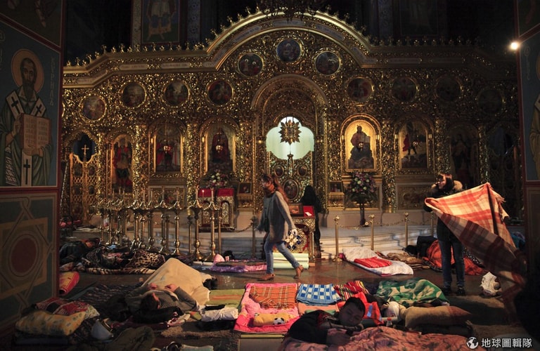 照片中的人們睡在烏克蘭當地的聖米迦勒金頂大教堂(Mikhailovsky Zlatoverkhy Cathedral)中,目前此地做為反政府示威者們的醫療據點。相關報導指出,21歲女性醫療志工據傳在抗議活動中頸部中彈,她在推特(Twitter)推文說「我就要死了」,引發許多網友悲傷同情。
