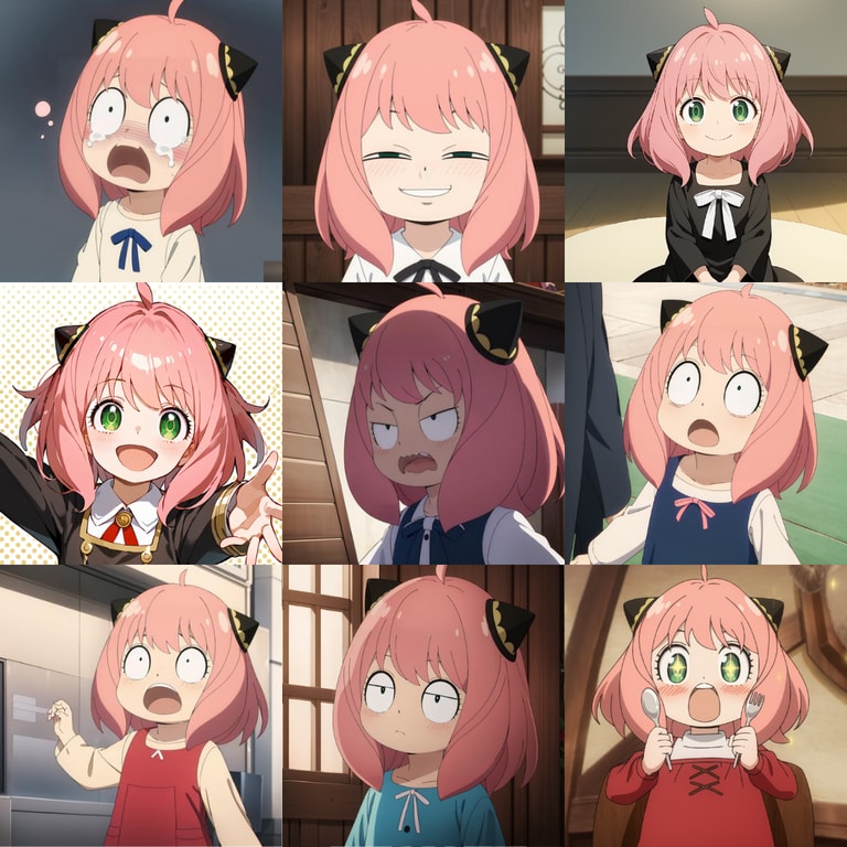 上圖為漫畫家遠藤達哉創作的日本漫畫《SPY×FAMILY間諜家家酒》中的角色安妮雅,一個擁有讀心術的超能力少女。但 9 張圖片中,只有「右下角」拿著刀叉的安妮雅是遠藤達哉親自繪製的,其他全部都是在專門分享AI生成圖片的社群平台Civitai,以「安妮雅」為題的AI創作圖片