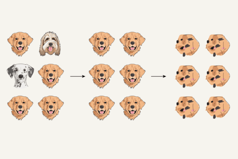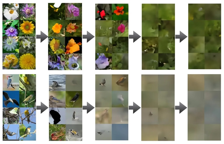 圖片中有著各式各樣的犬種,但經由AI訓練生成後,原先比例較高的黃金獵犬會佔據更大比例,而較稀有的犬種如法國鬥牛犬、柯基從中消失。假如利用AI生成的圖像再餵給AI模型,那麼黃金獵犬的比例變得更高,並且最終圖像失真不成犬型。