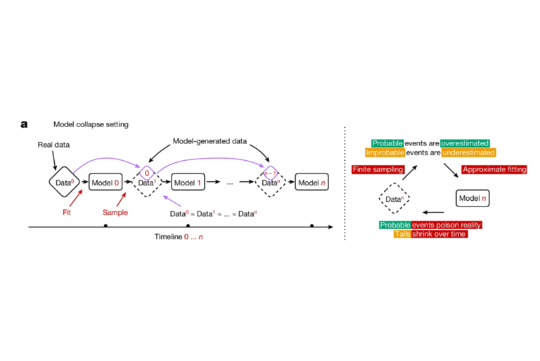 模型崩潰(Model collapse)指的是「使用由AI模型生成的內容來訓練AI。」但英國研究團隊在《自然》期刊上發布的研究揭露,這樣的作法會導致模型快速退化,漸漸從產出失真內容惡化到生成無意義的亂碼,最終變得毫無用處。