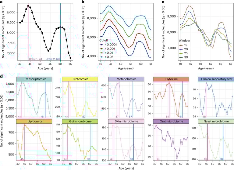 研究團隊追蹤了108名25至75歲的志願者,分析了超過13萬5千種不同的分子和微生物,包括RNA、蛋白質、代謝物以及人體微生物組。結果發現,人體分別在44歲左右和60歲左右會經歷兩次顯著的生理變化。