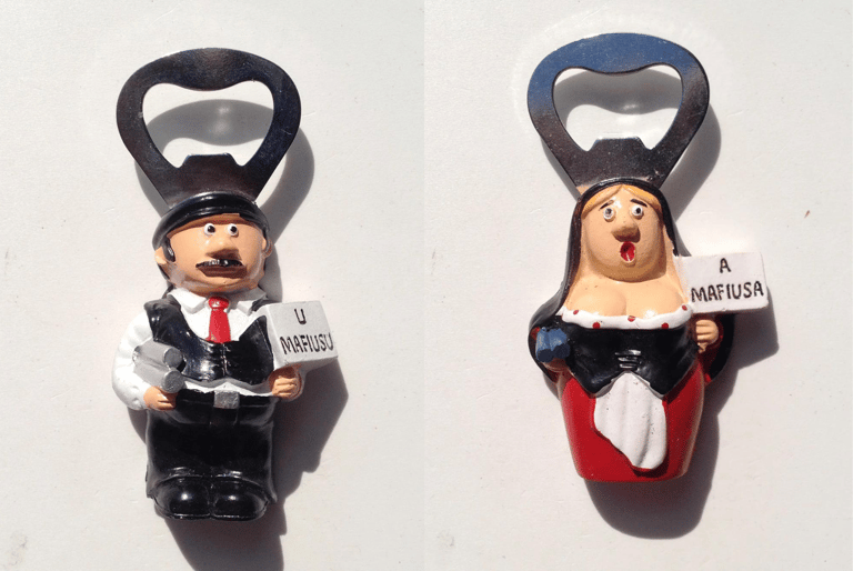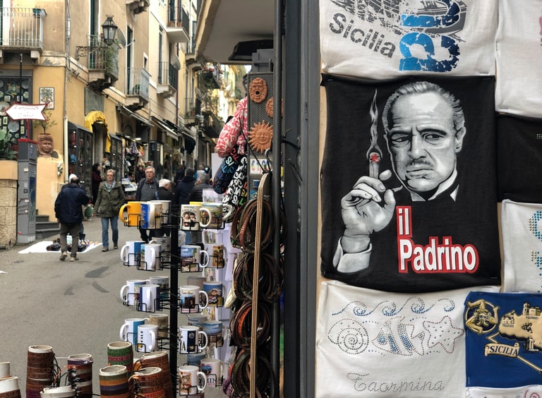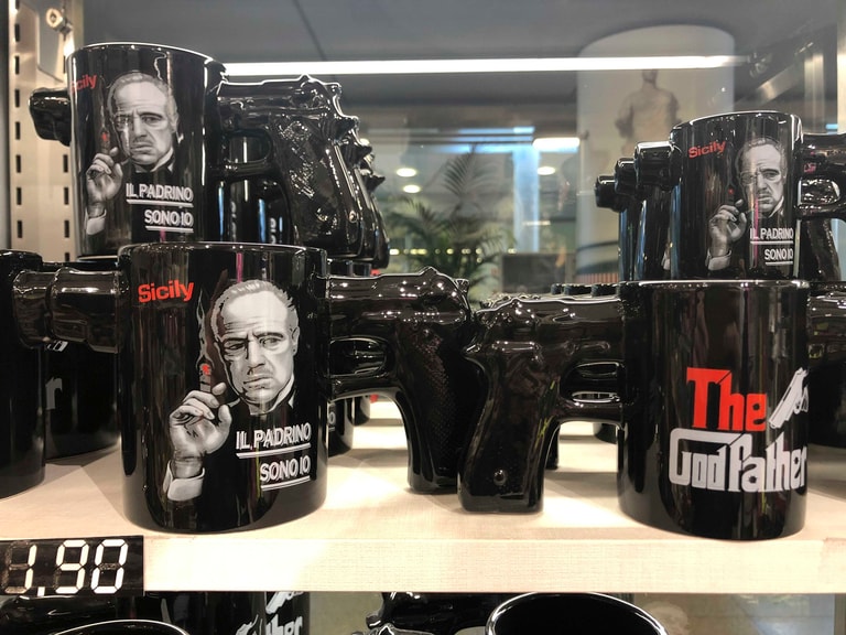 那麼,對於義大利的西西里島來說,什麼樣的紀念品最能代表當地?在此處的商店、攤販中,你可能見到的紀念品包括:印有電影《教父》中,黑手黨老大維托.柯里昂(Vito Corleone)的T-shirt,或是頭戴西西里島傳統帽「科波拉」(coppola)、手持短管獵槍「Lupara」,並印有「黑手黨份子」(u mafiusu)字樣的人偶。