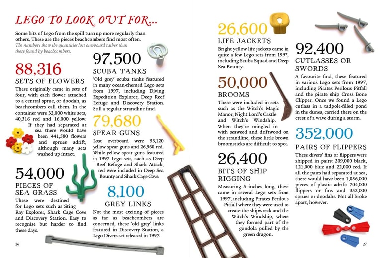 其中一個貨櫃裡,裝了將近480萬個樂高零件,零件全數散落水中。沒有人知道意外當下發生了什麼、貨櫃是如何打開,也沒有人知道其他貨櫃中究竟裝了什麼。但是在不久後,康瓦爾郡的海岸上,開始出現這些樂高零件的蹤影。