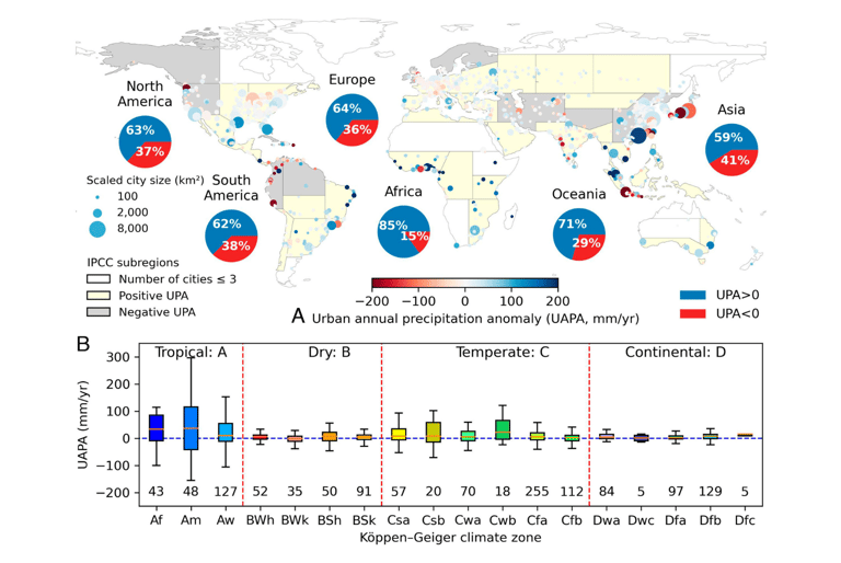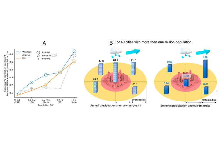 整體而言,人口、氣溶膠排放量和城市熱島效應較多的城市,比其他城市更有可能增加年降水量。