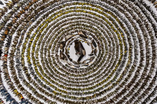 今年,冠軍由加拿大攝影師派翠西亞(Patricia Homonylo)的作品《當世界相撞》(When Worlds Collide)拿下。在這張照片中,超過4,000隻遭到「窗殺」的鳥類遺體,被排成一個個巨大的同心圓。