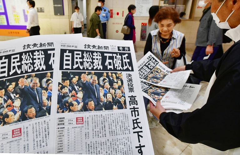 在第二輪決選投票中,石破茂以215票打敗高市早苗,成為下一屆自民黨總裁,同時也將成為日本第102代首相。他在演說時表示,「我長期參與國家安全保障的工作,將致力於保衛國家,保護國民。」