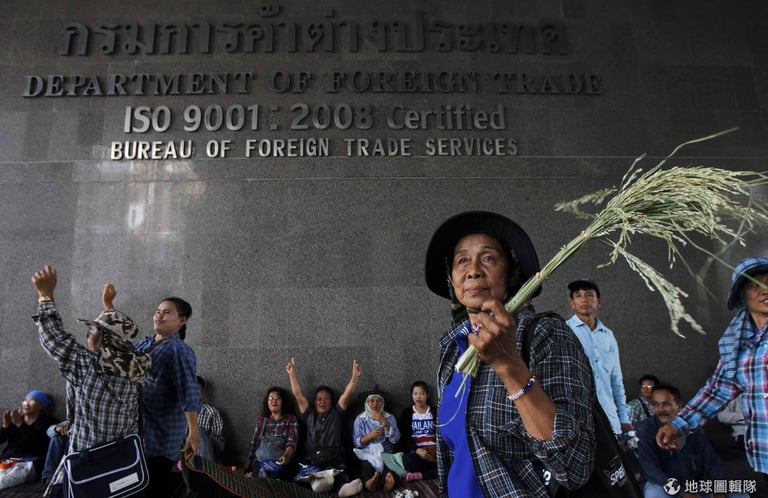 泰國不斷出現反政府的團體,例如照片中是不滿政府大米典押計畫的農民,這項備受爭議的計畫內容,主要是政府用高於市場的價格向稻農收購稻米,但這在批評人士的眼中,成了助長貪汙、耗盡國庫,並堆積了大量庫存米的錯誤措施。農民最後因為沒有收到政府該付的款項,在上周集結到曼谷當地。農民們的憤怒也被收編為反政府示威者們的力量之一