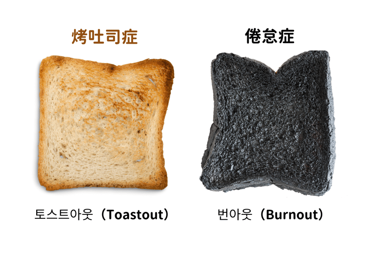 什麼是토스트아웃(Toastout)呢?不是早餐店老闆問你帥哥美女吐司要不要烤,而是將吐司比喻為人們身心能量完全喪失的倦怠症候群(Burnout)前兆,就像吐司在烤到焦黑成炭之前,外表正處於金黃微焦而內軟,彷彿人們身體與精神疲勞至極的狀態。