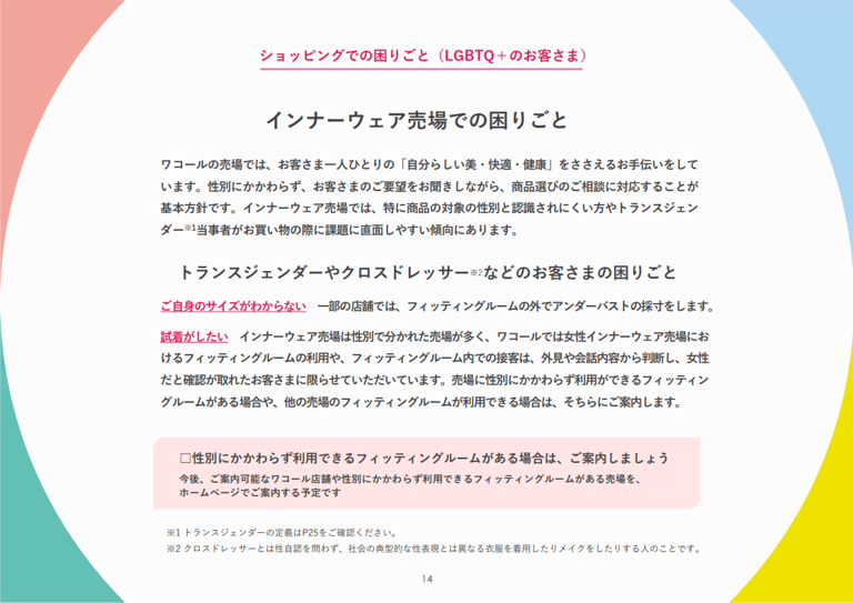 為避免誤解,我們再次強調,正如手冊中所述,華歌爾的女性內衣銷售區域的試衣間與試衣服務,僅限於根據外貌與對話內容確認為女性的顧客。此外,若賣場內有不分性別的試衣間,我們也會根據情況引導顧客使用其他賣場的試衣間。