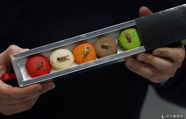 照片中的人員手中拿著美麗的馬卡龍,這些甜點的特別之處就是裡面內含脫水蟲子,位在法國的公司「微型營養」(Micronutris),在24號時向大眾介紹他們的蟲蟲甜點,他們也是歐洲境內唯一一家專營供人食用蟲子的公司,這些蟲子的販售方式有活體、脫水、或是磨成粉等等,照片中的馬卡龍就是摻入帶有蟲蟲粉的甜點。