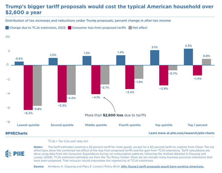 拜登的經濟顧問委員會首席經濟學家厄尼.泰德斯基(Ernie Tedeschi)則評估,此項關稅策略將使美國普通家庭每年增加約1,000美元的支出。而在8月大選之前,美國彼得森國際經濟研究所(The Peterson Institute for International Economics,PIEE)也進行估算,川普的關稅政策將使美國家庭平均每年增加超過2,600美元的支出。