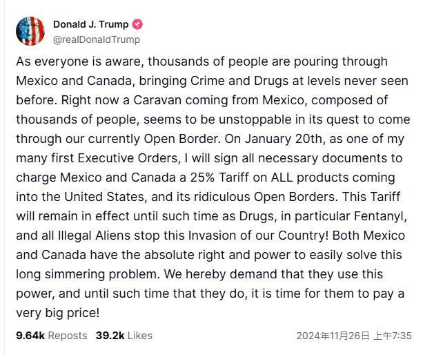 週一(11/25)川普宣布,他將於明年1月20日就職後立即簽署行政命令,對所有來自加拿大和墨西哥的進口商品課徵25%的關稅。川普表示,此措施將持續至兩國停止毒品和非法移民進入美國為止。他在社交平台Truth Social的貼文中強調:「這項關稅將一直生效,直到芬太尼(Fentanyl)等毒品及所有非法移民停止侵略我們的國家!」川普在社交平台Truth Social表示:加拿大和墨西哥有能力快速解決這個長期存在的問題,並要求兩國採取行動,否則必須承擔「巨大的代價」。