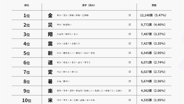 但幸好,2024年有大谷翔平帶來的希望。他在大聯盟的卓越表現不僅振奮日本人心,更激勵許多人希望能如同大谷翔平一般展翅飛「翔」。透過這些運動選手的精彩表現,為人們帶來更多「樂」的時光。而排名第十的「米」字,不只反映了人們對國內米荒與價格飆升的不滿,也因日本將美國寫作「米国」,讓旅美球員大谷翔平為這個漢字增添了特別的意義。