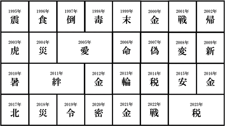 自1995年舉辦至今,「金」分別在2000、2012、2016與2021年,包括2024年,五度被選為年度漢字,成為年度漢字的常客代表。而「戰」、「災」、「稅」則分別當選兩次年度漢字。