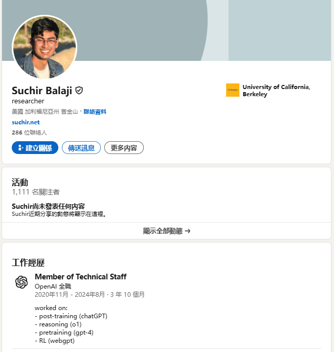 巴拉吉於今年8月離開OpenAI,此後他多次公開指控該公司在訓練其熱門AI產品ChatGPT時,違反美國版權法,使用了未經授權的受版權保護資料。他的指控內容被認為對多起針對OpenAI的法律訴訟具有關鍵意義,包括多家出版商、作家及藝術家聲稱該公司非法使用其作品進行AI模型訓練。
