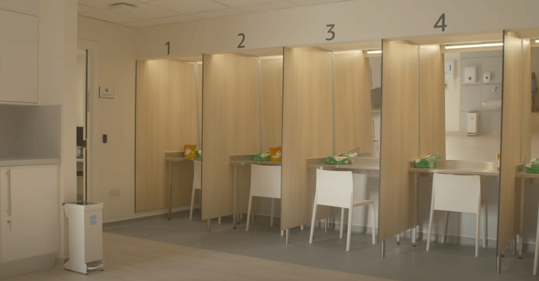 「薊花」的設計充分展現了對使用者需求的細膩考量。包括8個配有傾斜鏡面的注射隔間,讓護理師能在不打擾使用者的情況下監控注射過程。為營造溫暖包容的氛圍,中心還提供放鬆休息區,配有舒適沙發、書籍、益智遊戲和塗色書,並設置淋浴間、洗衣設施及室外吸菸區。這些細節大多源自前吸毒者顧問團的建議,反映了對使用者需求的深度理解。