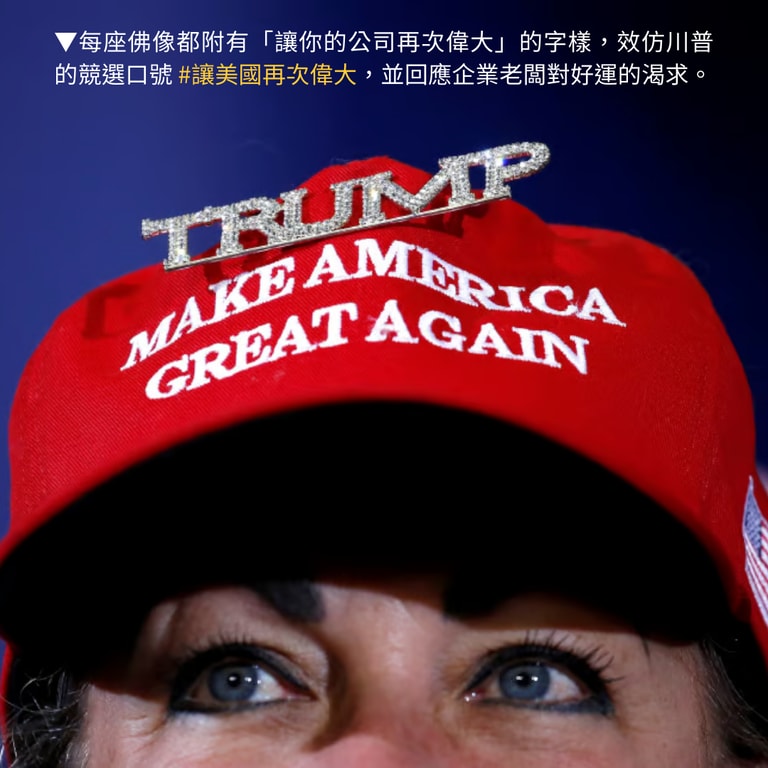除了搞笑,洪金世也觀察到白手起家的創業者們渴求好運的願望,因此每座川普佛像都附有「讓你的公司再次偉大」的字樣。