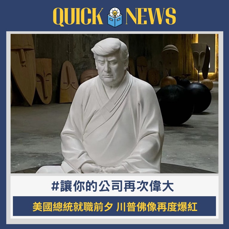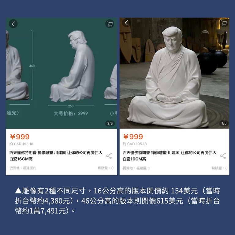 不過,這也不是首次有人企圖讓川普化身神佛。先前在美國網購平台Etsy上,同樣曾出現過一尊用3D列印機製成的塑膠川普佛像,而且開價更便宜,只需要約台幣265元,即可將川普佛像列入收藏。