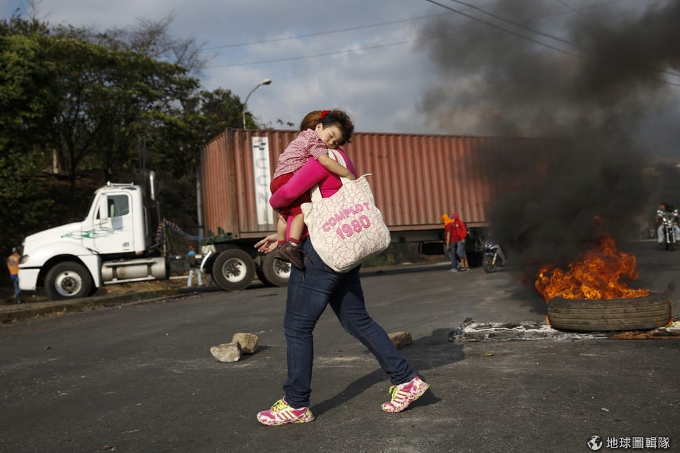 抱著寶寶的女子走過被攻擊的軍營附近,此處剛剛遭受到反政府示威者的攻擊陷入火海。26號時,教宗方濟各(Pope Francis)疾呼委內瑞拉政府盡快結束這場已經奪去13條人命的動亂。