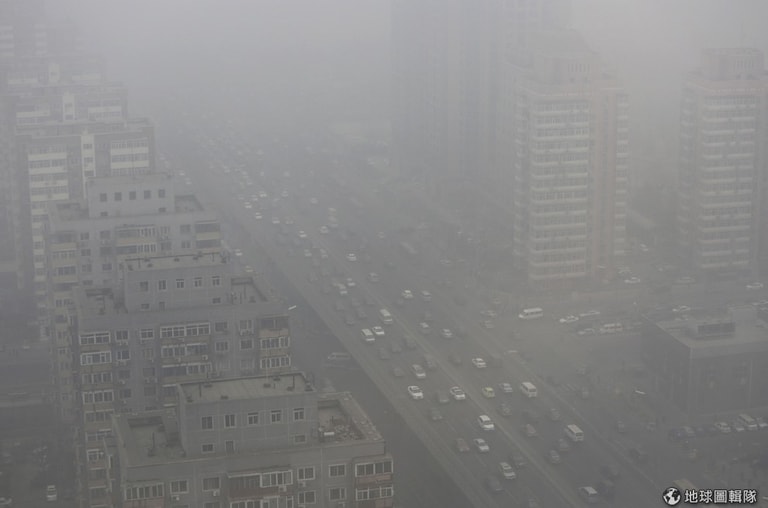 照片中可見霾害籠罩北京市區,當地三環路一帶難以清楚看見