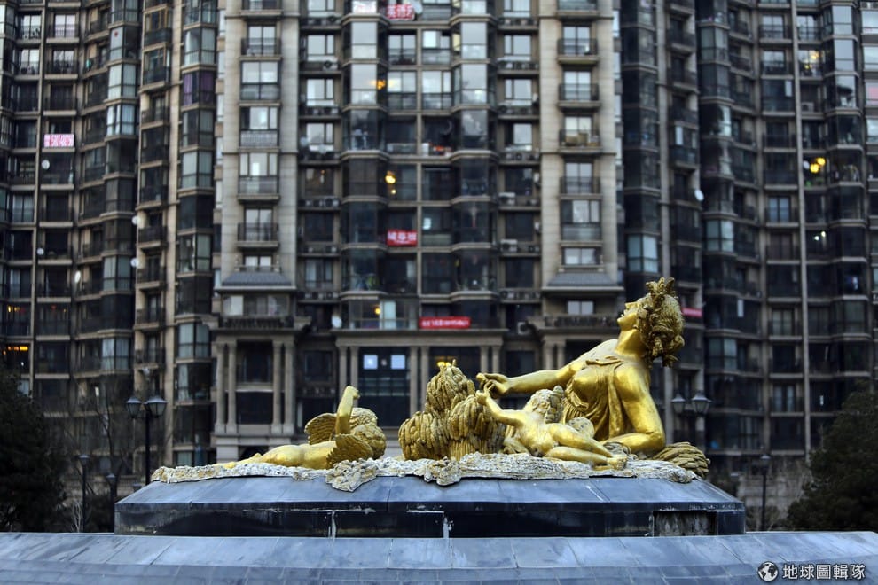 北京一處公寓大樓前,有著金黃雕像現身。26號時,中國當地媒體報導到近日政府打房政策收效,房市熱度開始趨緩,但外界也希望政府可以確保這股打房不會造成經濟不穩