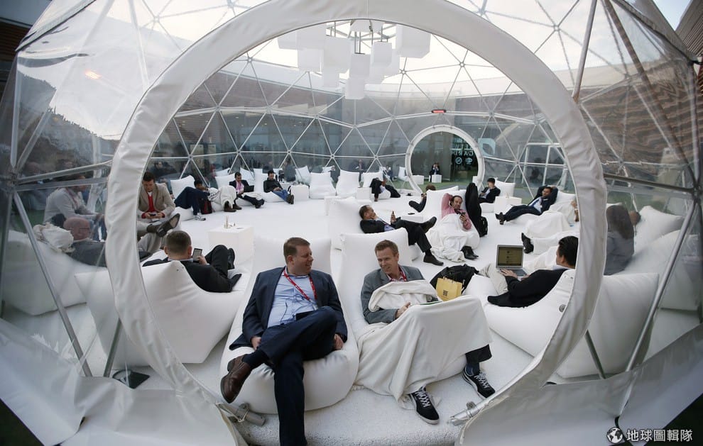 參加「世界行動通訊大會」(Mobile World Congress)的人們坐在透明泡泡中。根據報導,研調機構顧能(Gartner)指出,除了穿戴式科技,預期連網汽車和智慧城市也將是展覽重要主題。