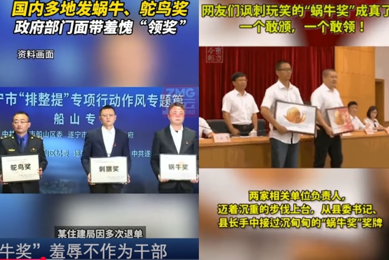 為了打擊低效率的公務員,中國多地政府開始頒發「蝸牛獎」,用來公開「激勵」那些工作表現不佳的公務員。《人民日報》報導指出,至少三個城市已經實施這項做法,甚至在官媒播放的畫面中,能看到公務員神情嚴肅地接過獎狀。有地方政府還建立了「躺平公務員」數據庫,追蹤那些消極怠工的人,甚至直接降職或解僱。媒體評論稱,這種「帶有諷刺意味的鼓勵」,是為了讓被點名的公務員「臉紅流汗,重新振作」,因為他們的懶散行為損害了黨和政府的公信力。