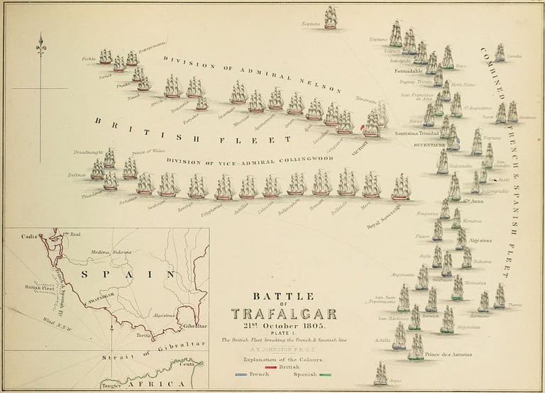 總計33艘戰艦的法西聯合艦隊,包括一艘當時最大的四層甲板戰艦「三叉戟號」,在面對總計27艘戰艦,而且大多為三層或二層甲板戰艦的英國艦隊,看似勝券在握。面對大軍壓境,英國主帥納爾遜中將(The Viscount Nelson)對艦隊發出著名通令:「英格蘭期盼人人都恪盡其責!」特拉法加海戰正式敲響戰鼓。