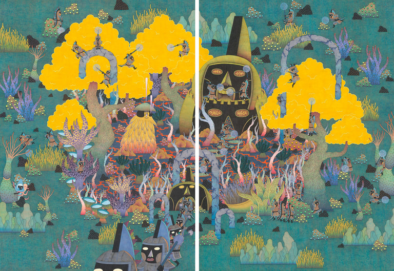 在不同畫廊的展間中,藝術家們也透過不同的作品回應「娛樂世界」的主題。合作逾17年的雙人藝術創作組合林餘慶、魏杏諭,他們作品中的主角「Wulala」猶如引路精靈,承載藝術家對未知生活的不安與對未來的熱情期待,帶領觀者踏入奇幻繽紛的想像世界。