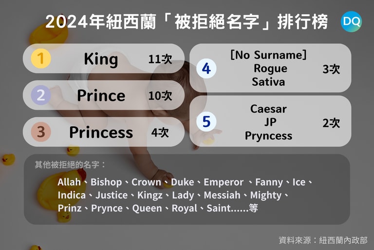 根據紐西蘭內政部(Department of Internal Affairs)提供的資料,該國2024年總計有60,000個新生兒出生,其中有38個命名提案遭到駁回。而「King」這個名字,已經連續14年蟬聯「拒絕名字排行榜」冠軍,成為禁名榜首,直到2023年被「Prince」短暫取代。2024年兩者則分別佔據第一與第二名。