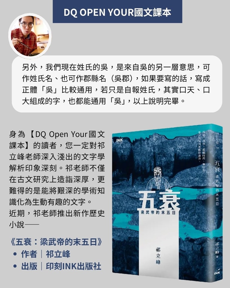 然而,這個看似簡單的姓氏拼讀問題,背後其實牽涉到漢字演變的學問。「吳」字到底該怎麼拆解?「口天吳」的說法究竟對不對?為了深入探討這個文字學問題,DQ特別邀請臺灣師範大學國文系祁立峰教授為讀者詳細解析。