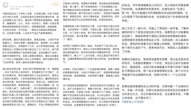 在中國的社群媒體微博上,許多海棠作者講述自己被抓捕的過程。筆名「Sijindejin」的作家表示,今年五月她接到通知,要求她到甘肅的公安局報到——該地距離她位於成都的家鄉村莊約970公里。而她在貼文中絕望地寫道,「我以為能通過寫作擺脫既定命運軌跡的枷鎖,也以為我筆下寫的是我的未來,但沒想過這個未來指向的是牢獄。」