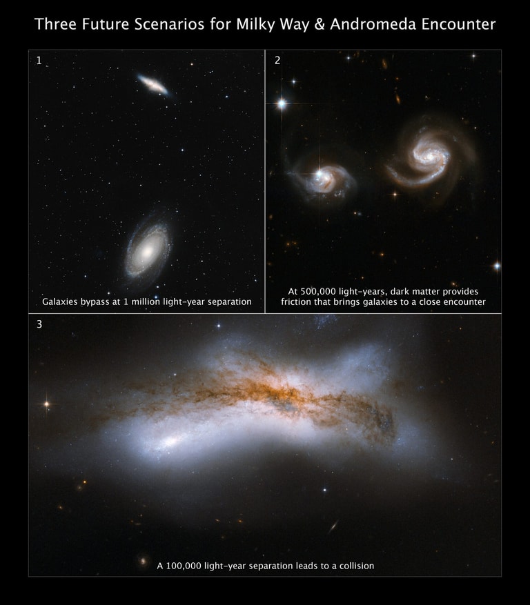 新結果仍然表明在40億到50億年後,兩個星系約2%的小機率發生正面碰撞。考慮到日漸暖化的太陽會在大約10億年後讓地球變得不適合居住,而太陽本身也很可能在50億年後燃燒殆盡,因此與仙女座相撞是我們在宇宙中最不需要擔心的事。