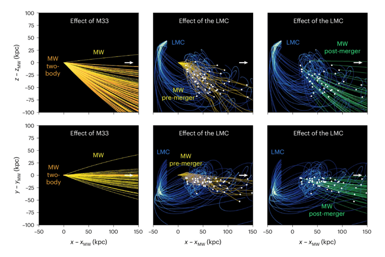 M33的額外質量將銀河系稍微拉向它,然而LMC則將銀河系拉離軌道平面,遠離仙女座星系。這並不意味著LMC能使我們免於合併,而是降低了合併的可能性。