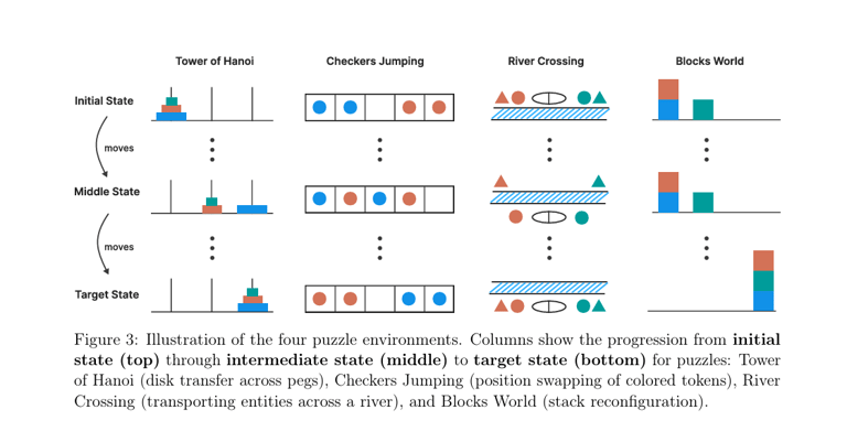研究團隊使用可控的邏輯拼圖環境(controllable puzzle environments)來測試模型推理極限:透過一系列邏輯推理拼圖(如河川過渡、漢諾塔塔),並將問題複雜度分級控制(低、中、高)。每個環境維持相同邏輯結構,但改變組合(如增加塔層、高度),精確操控「複合性」變數。設計的測試包括經典的邏輯謎題,如「渡河問題」與「河內塔問題」,這些需要模型進行多步推理與規劃。研究人員特別設計,讓題目區分成「簡單、中等、困難」三種難度。
